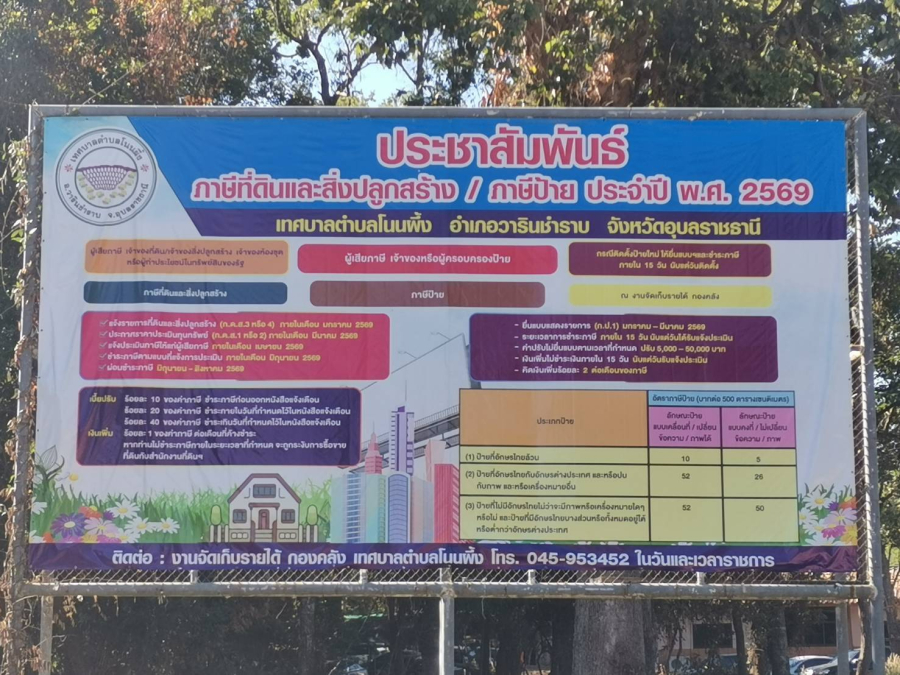 วันศุกร์, 13 กุมภาพันธ์ 2569 15:47เทศบาลตำบลโนนผึ้ง ประชาสัมพันธ์การชำระภาษีที่ดินและสิ่งปลูกสร้าง/ภาษีป้าย ประจำปี พ.ศ.2569